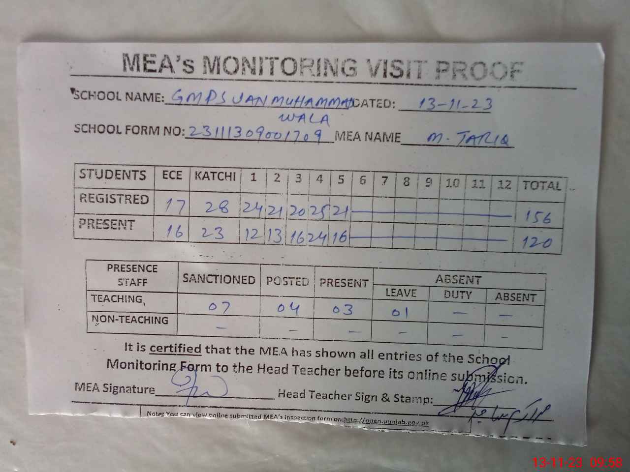 | Attendance Register | Head Teacher | MEA with School | Visit Proof |