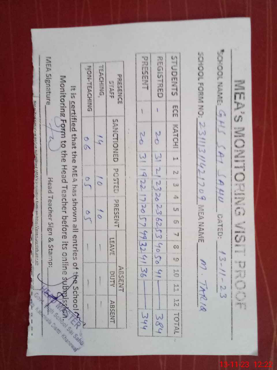 | Attendance Register | Head Teacher | MEA with School | Visit Proof |