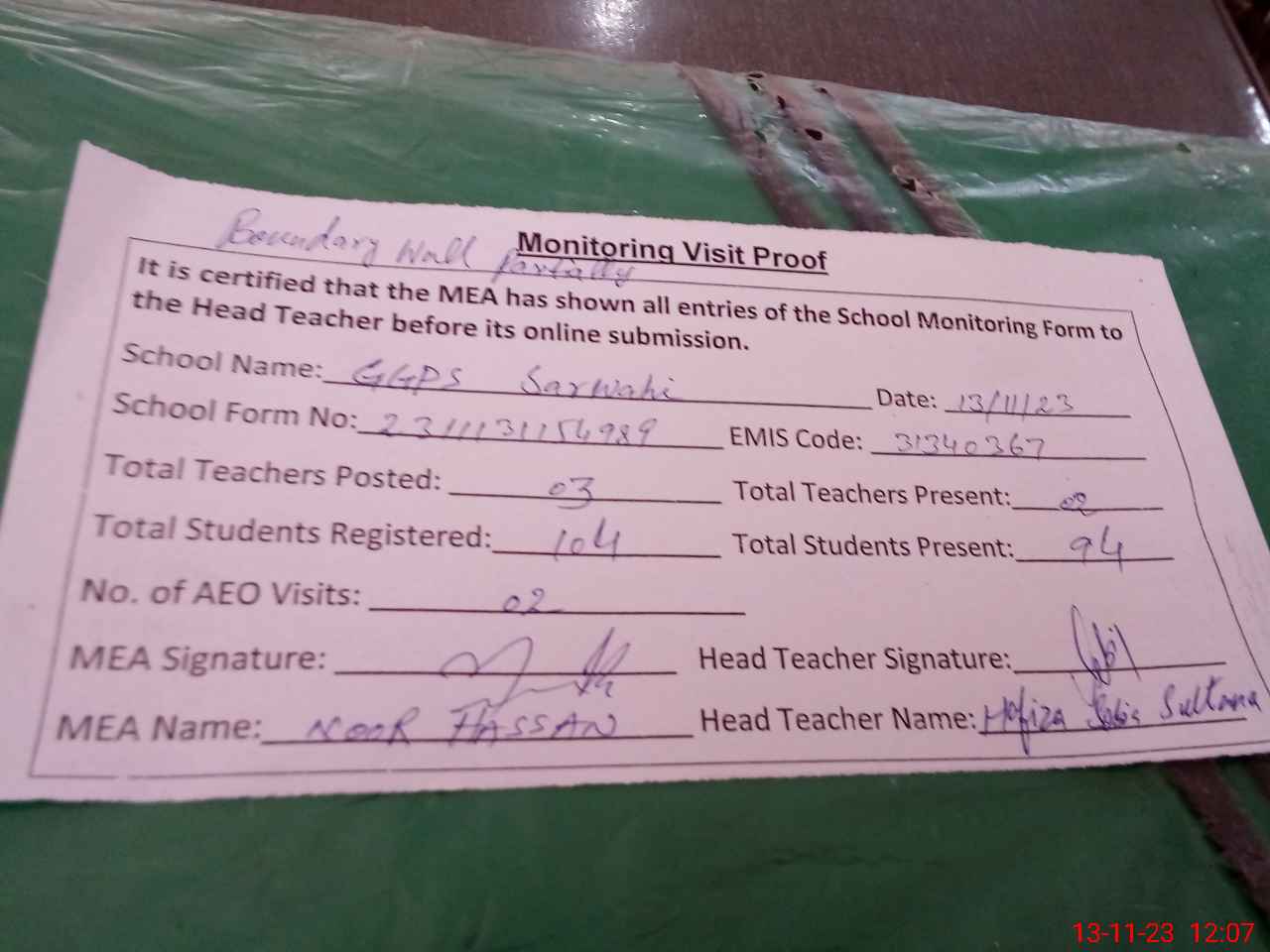 | Attendance Register | Head Teacher | MEA with School | Visit Proof |