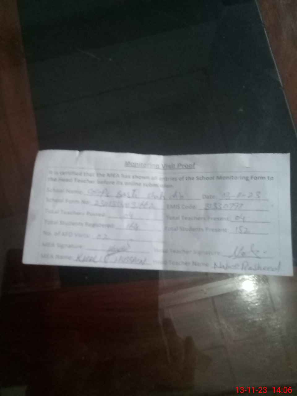 | Monitoring Date: 13-11-2023 | Start Time: 13-11-2023 01:32 PM | End Time: 13-11-2023 02:06 PM | Name of MEA: Kh**** Hu**** | |