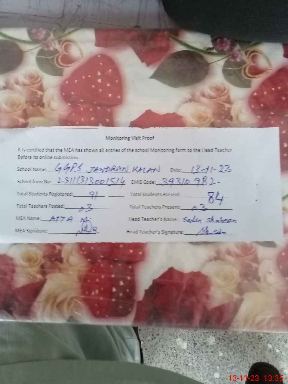 | Attendance Register | Head Teacher | MEA with School | Visit Proof |