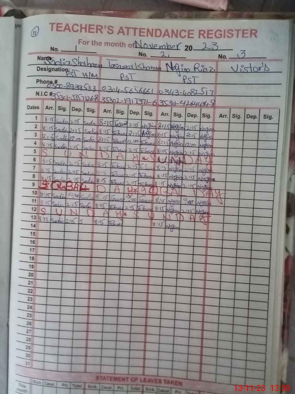 | CNIC | Full Name | Designation | R/C | Absence During Last Calender Month |