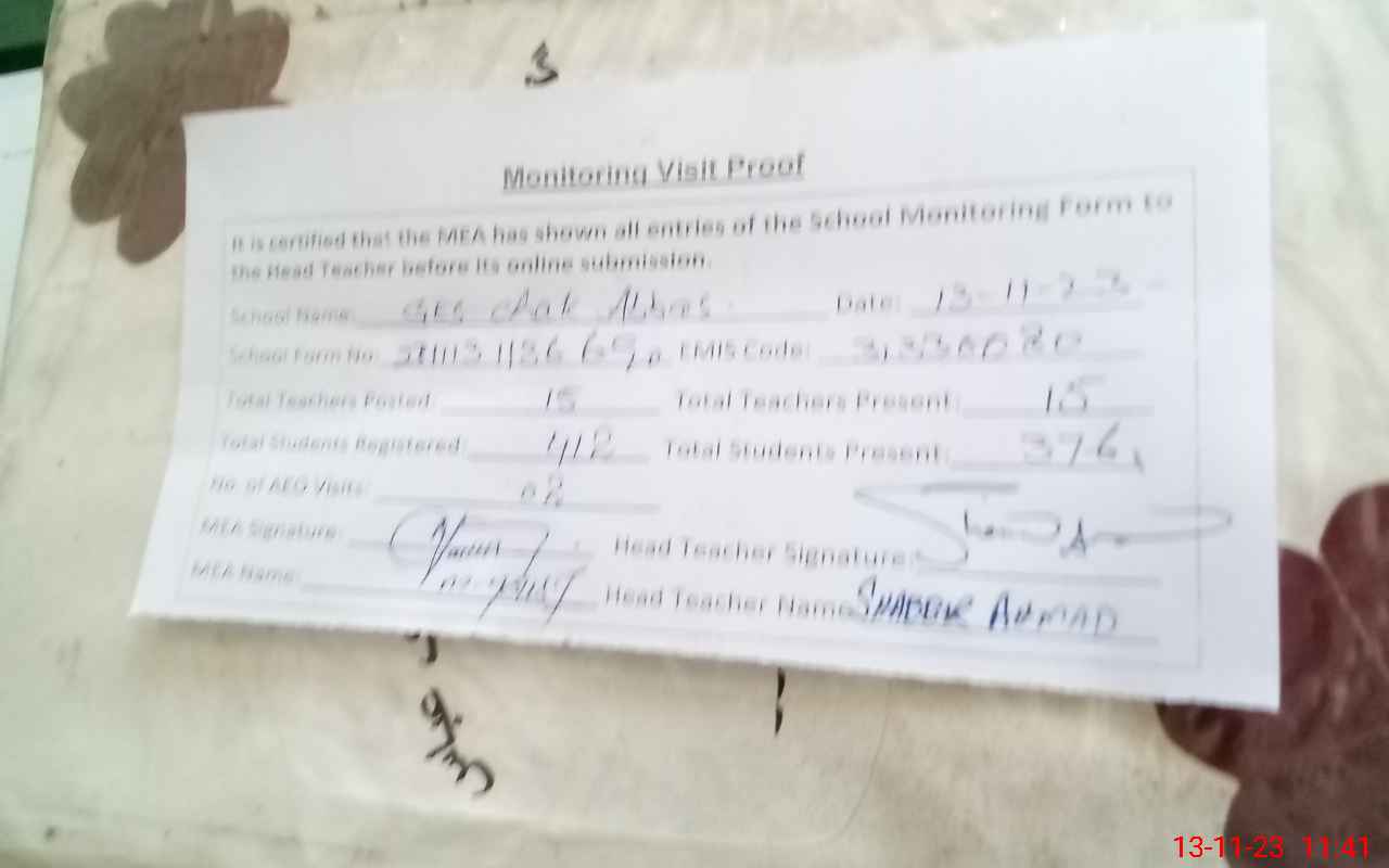 | EMIS Code: 31330080 | Name of School: GES CHAK ABBAS | |||
