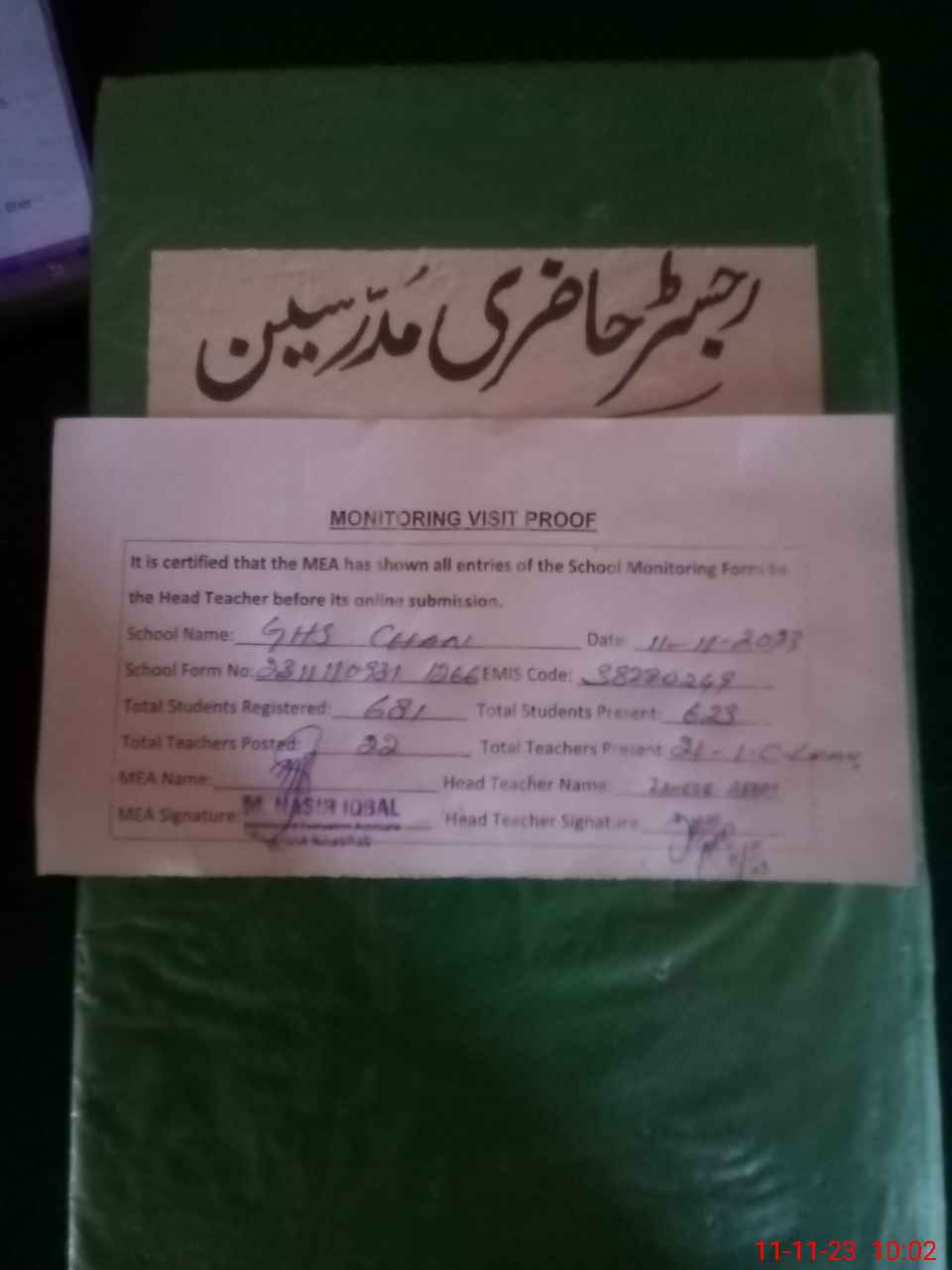| Attendance Register | Head Teacher | MEA with School | Visit Proof |