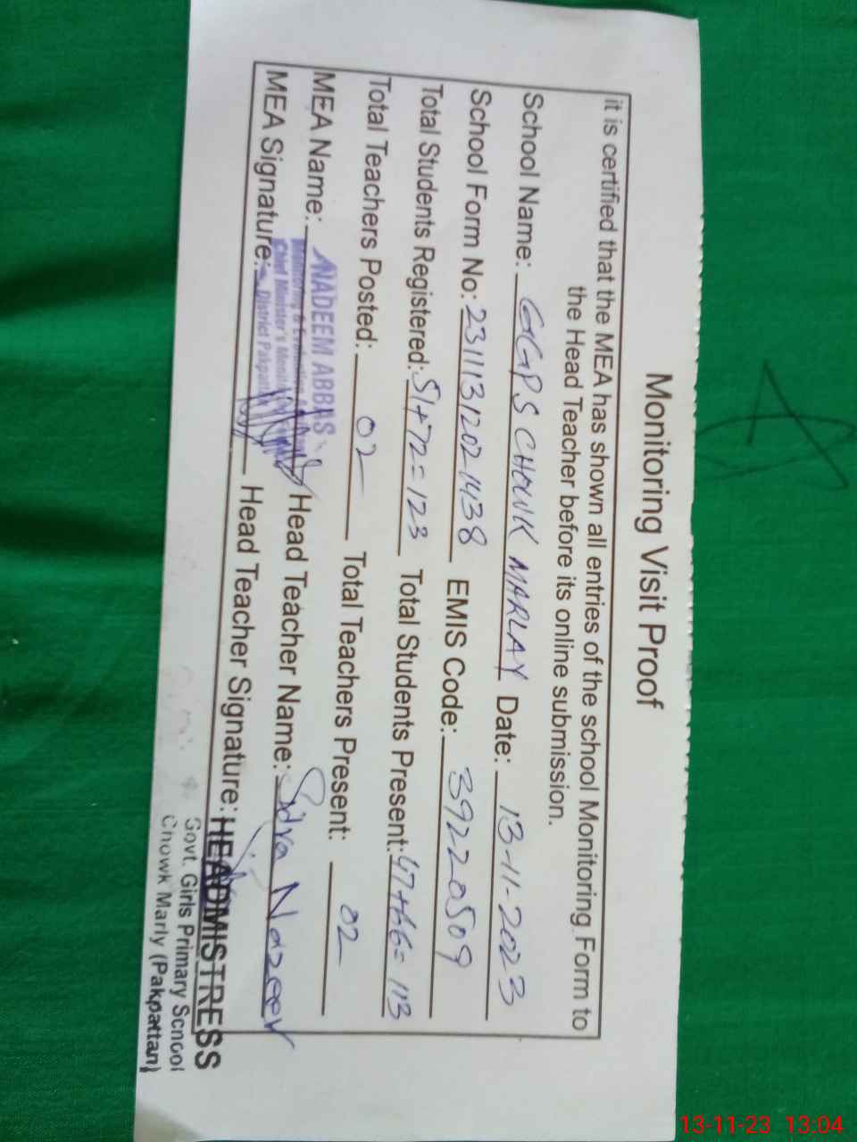 | Attendance Register | Head Teacher | MEA with School | Visit Proof |