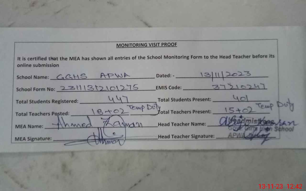 | EMIS Code: 37210247 | Name of School: GGHS APWA JHELUM | |||