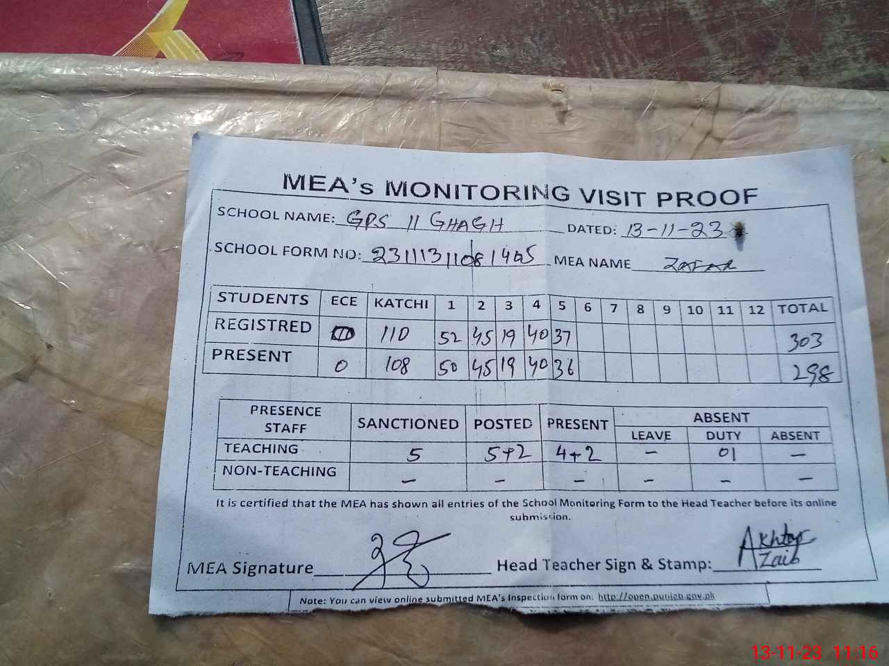 | Attendance Register | Head Teacher | MEA with School | Visit Proof |