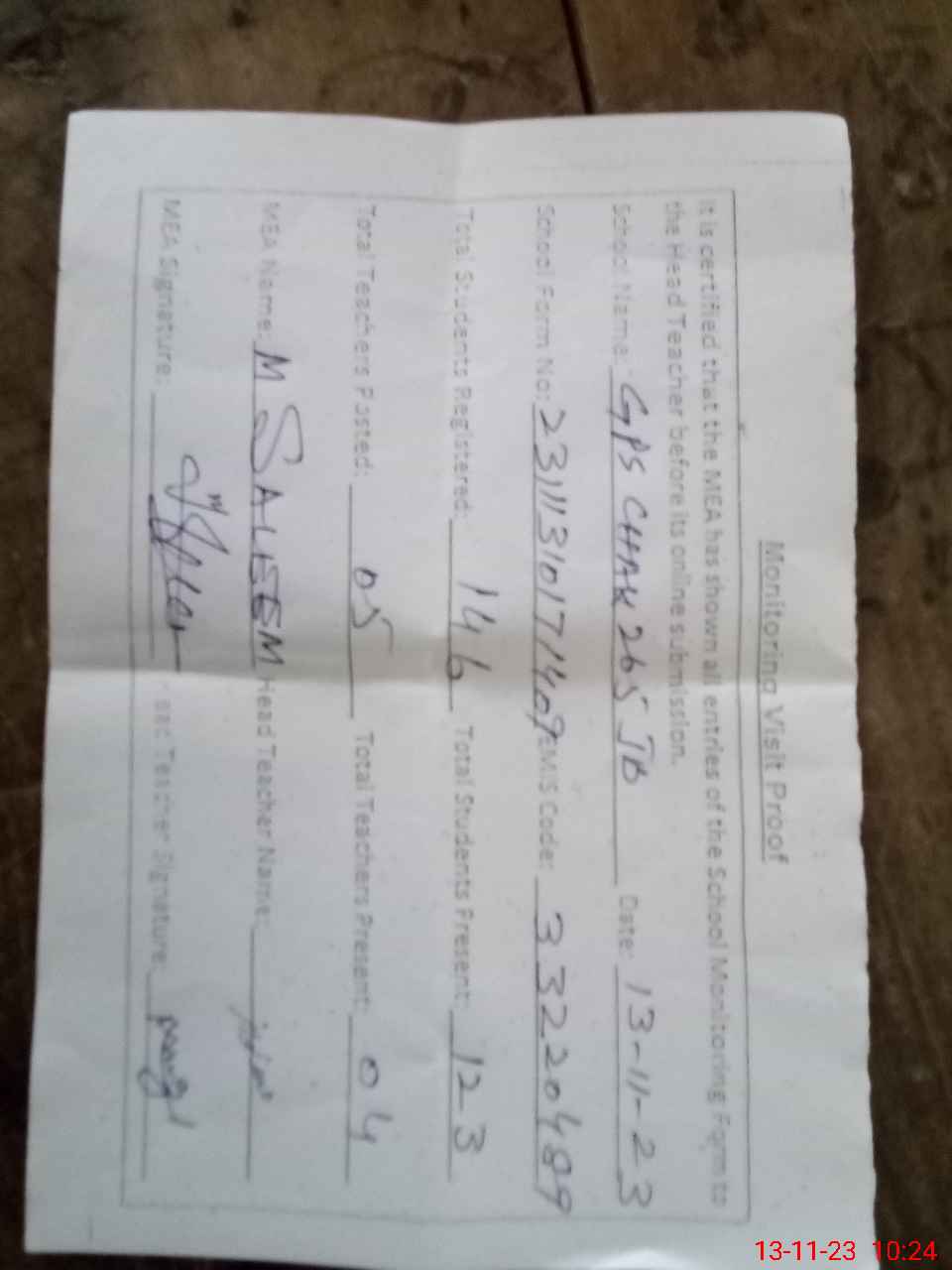 | Attendance Register | Head Teacher | MEA with School | Visit Proof |