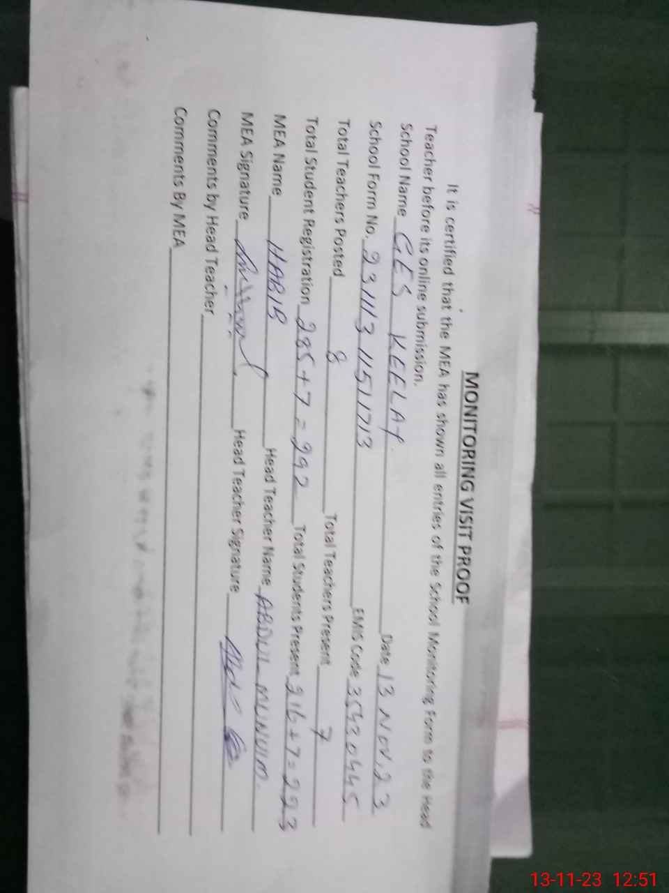 | Attendance Register | Head Teacher | MEA with School | Visit Proof |