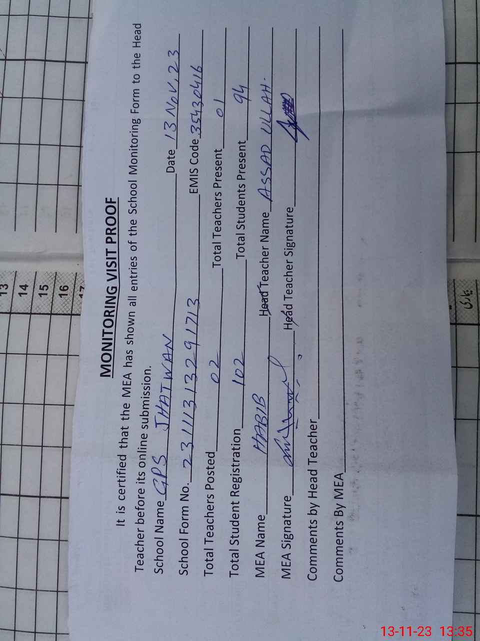 | Attendance Register | Head Teacher | MEA with School | Visit Proof |