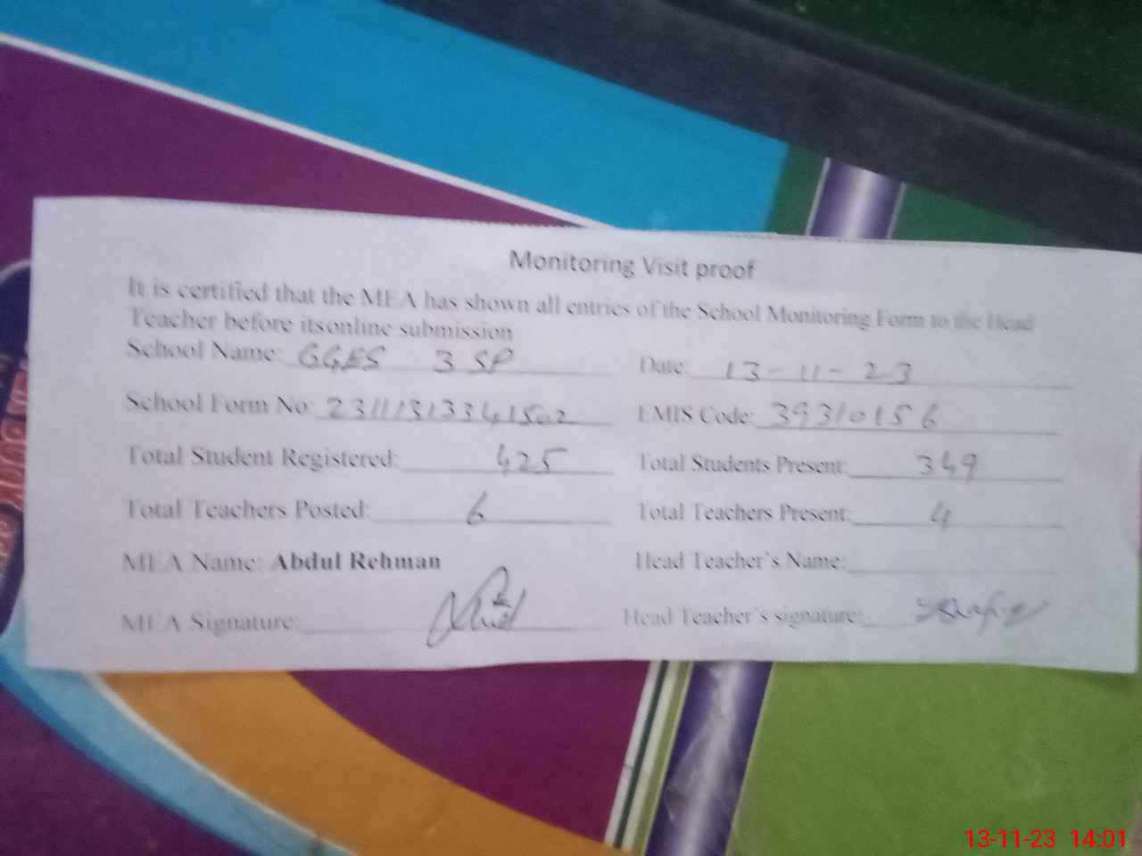 | Attendance Register | Head Teacher | MEA with School | Visit Proof |