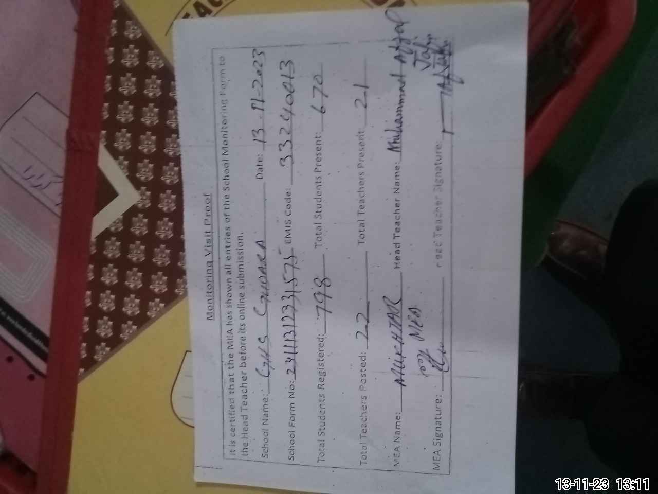 | Attendance Register | Head Teacher | MEA with School | Visit Proof |