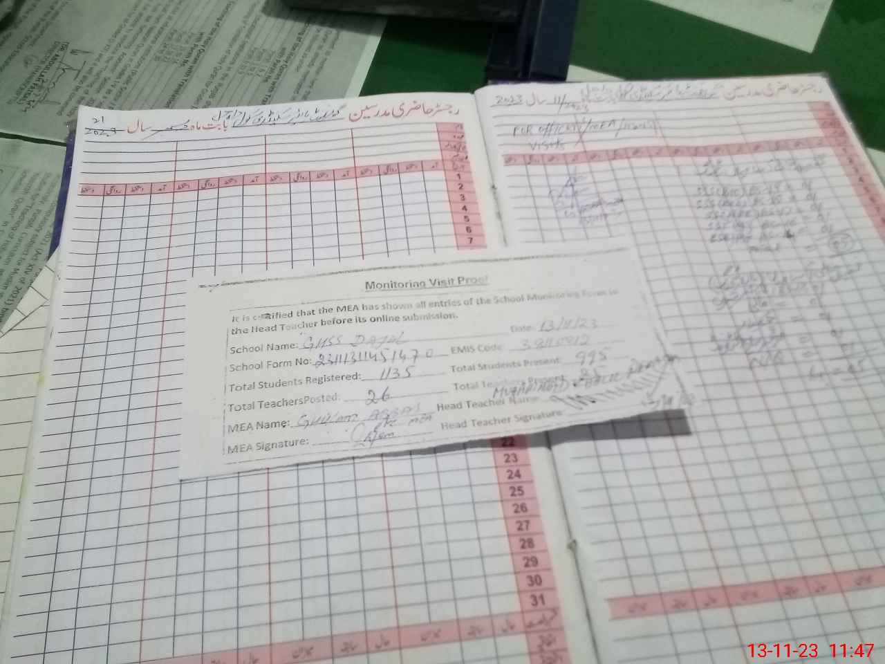 | Attendance Register | Head Teacher | MEA with School | Visit Proof |