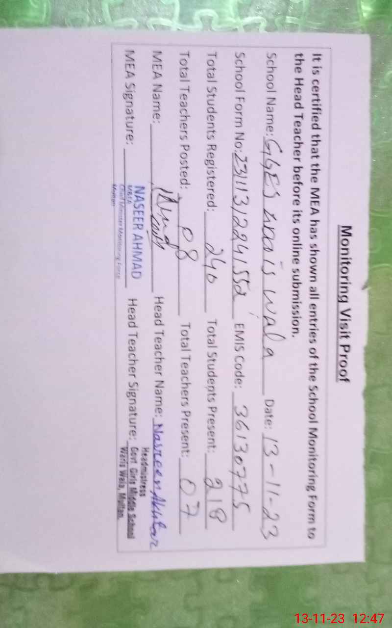 | EMIS Code: 36130775 | Name of School: GGES WARIS WALA MULTAN SADDAR | |||