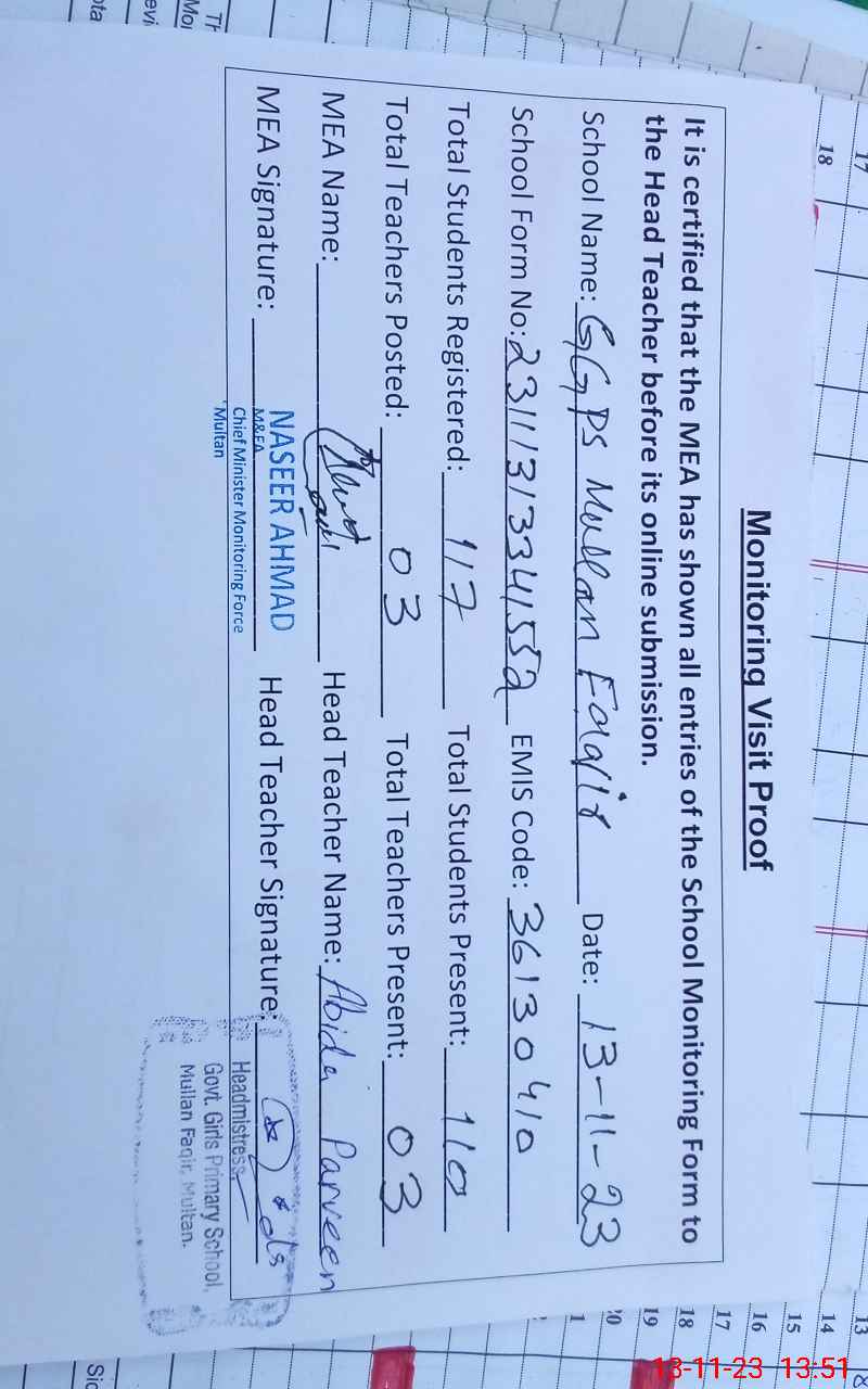 | EMIS Code: 36130410 | Name of School: GGPS MULAN FAQIR MULTAN | |||