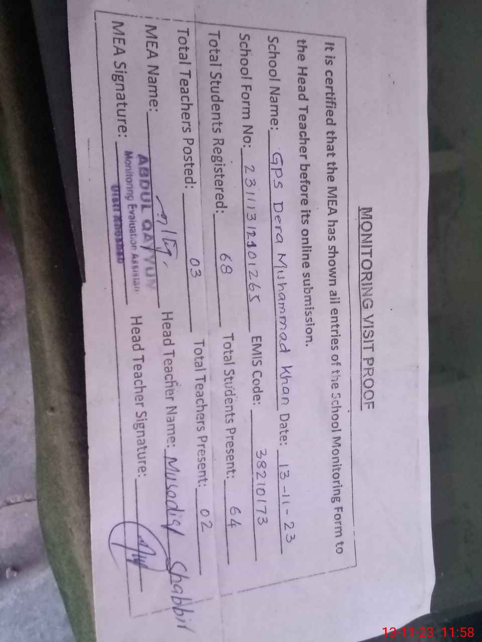 | Attendance Register | Head Teacher | MEA with School | Visit Proof |