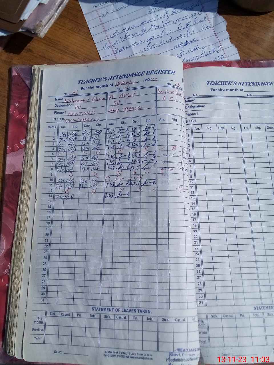 | CNIC | Full Name | Designation | R/C | Absence During Last Calender Month |