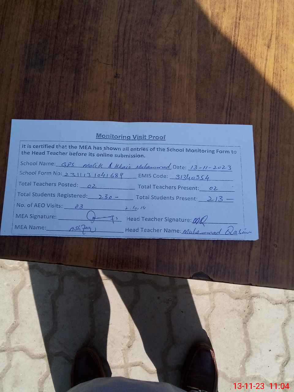 | Attendance Register | Head Teacher | MEA with School | Visit Proof |