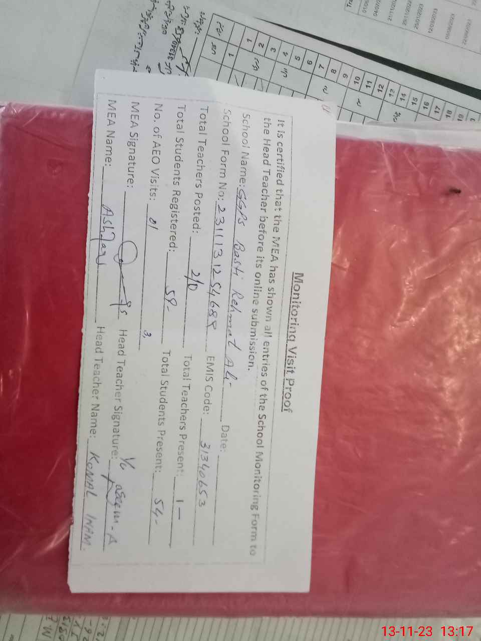 | Attendance Register | Head Teacher | MEA with School | Visit Proof |