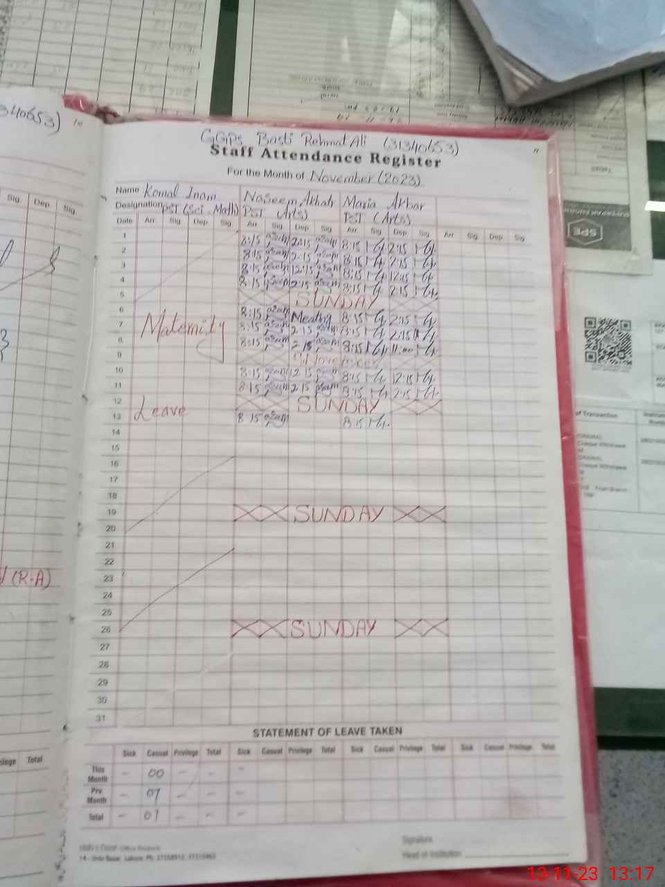 | CNIC | Full Name | Designation | R/C | Absence During Last Calender Month |