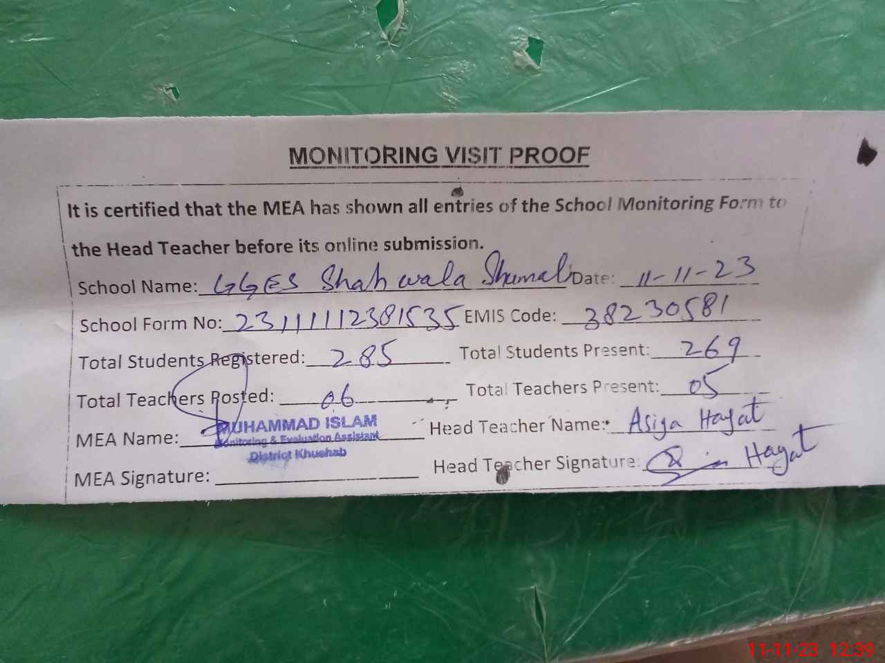 | EMIS Code: 38230581 | Name of School: GGES SHAH WALA SHUMALI | |||