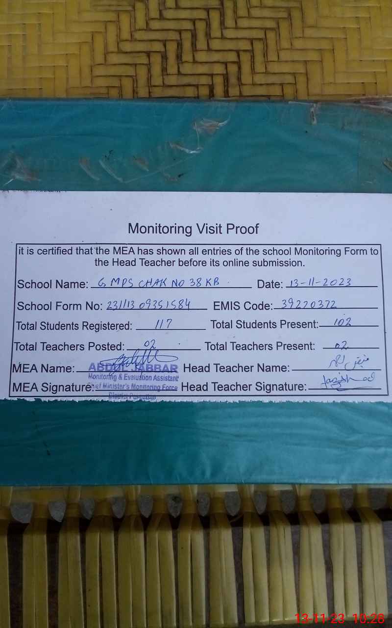 | EMIS Code: 39220372 | Name of School: GMPS CHAK NO 38 KB | |||