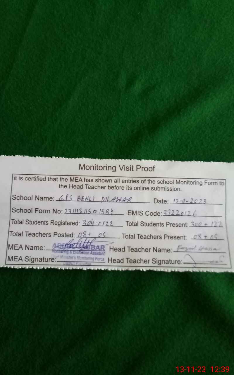 | EMIS Code: 39220126 | Name of School: GPS BEHLI DILAWAR | |||