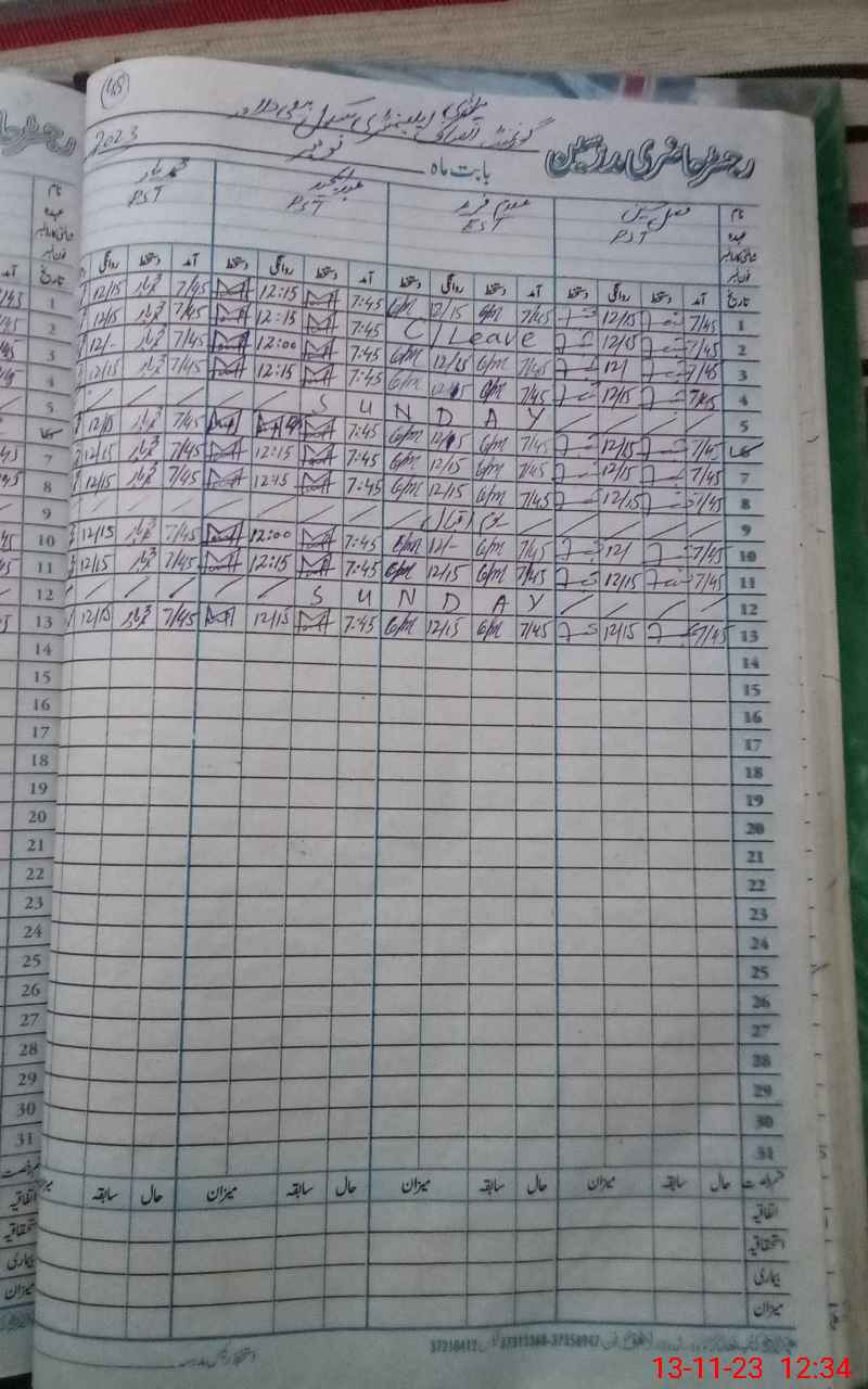 | CNIC | Full Name | Designation | R/C | Absence During Last Calender Month |