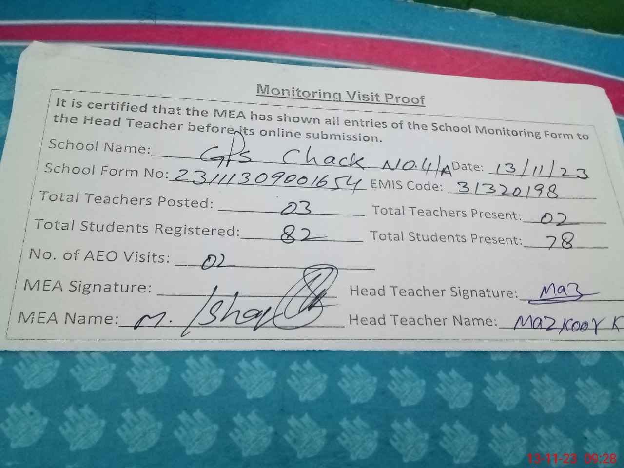 | Attendance Register | Head Teacher | MEA with School | Visit Proof |