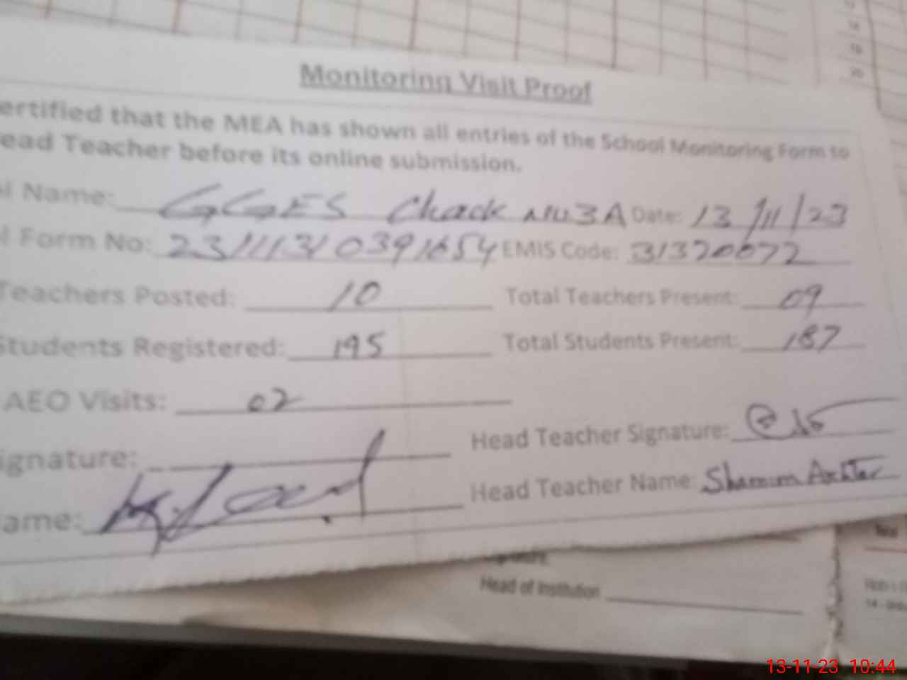 | Attendance Register | Head Teacher | MEA with School | Visit Proof |