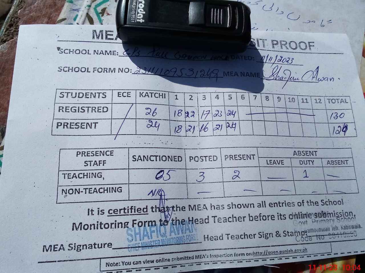 | Attendance Register | Head Teacher | MEA with School | Visit Proof |