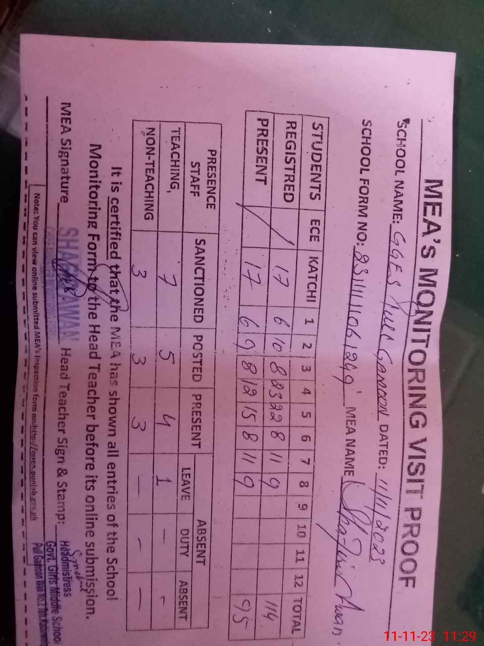 | Attendance Register | Head Teacher | MEA with School | Visit Proof |