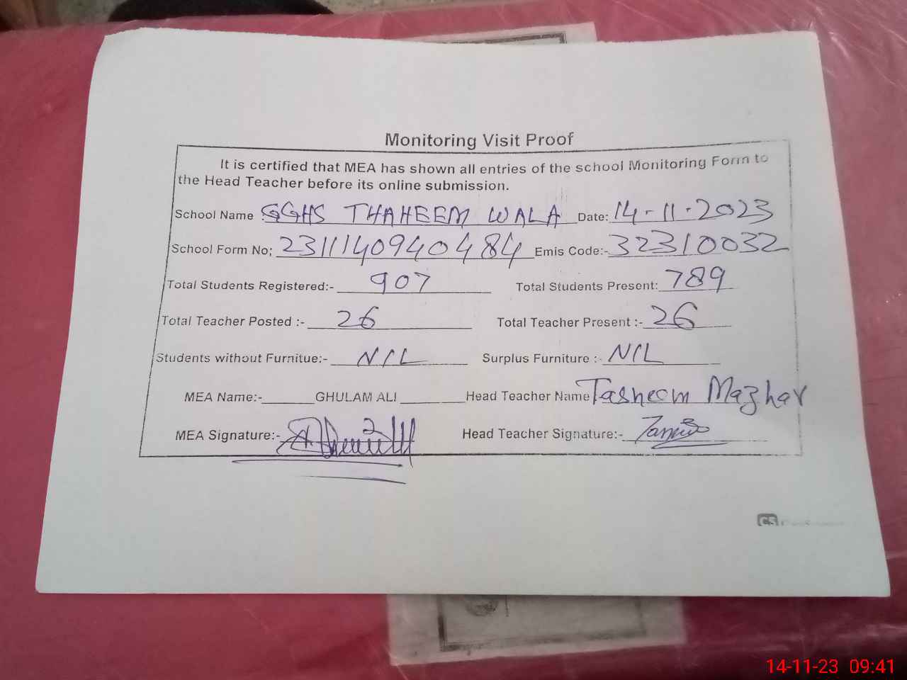 | Attendance Register | Head Teacher | MEA with School | Visit Proof |