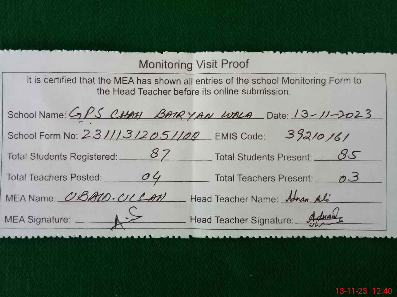 | Attendance Register | Head Teacher | MEA with School | Visit Proof |