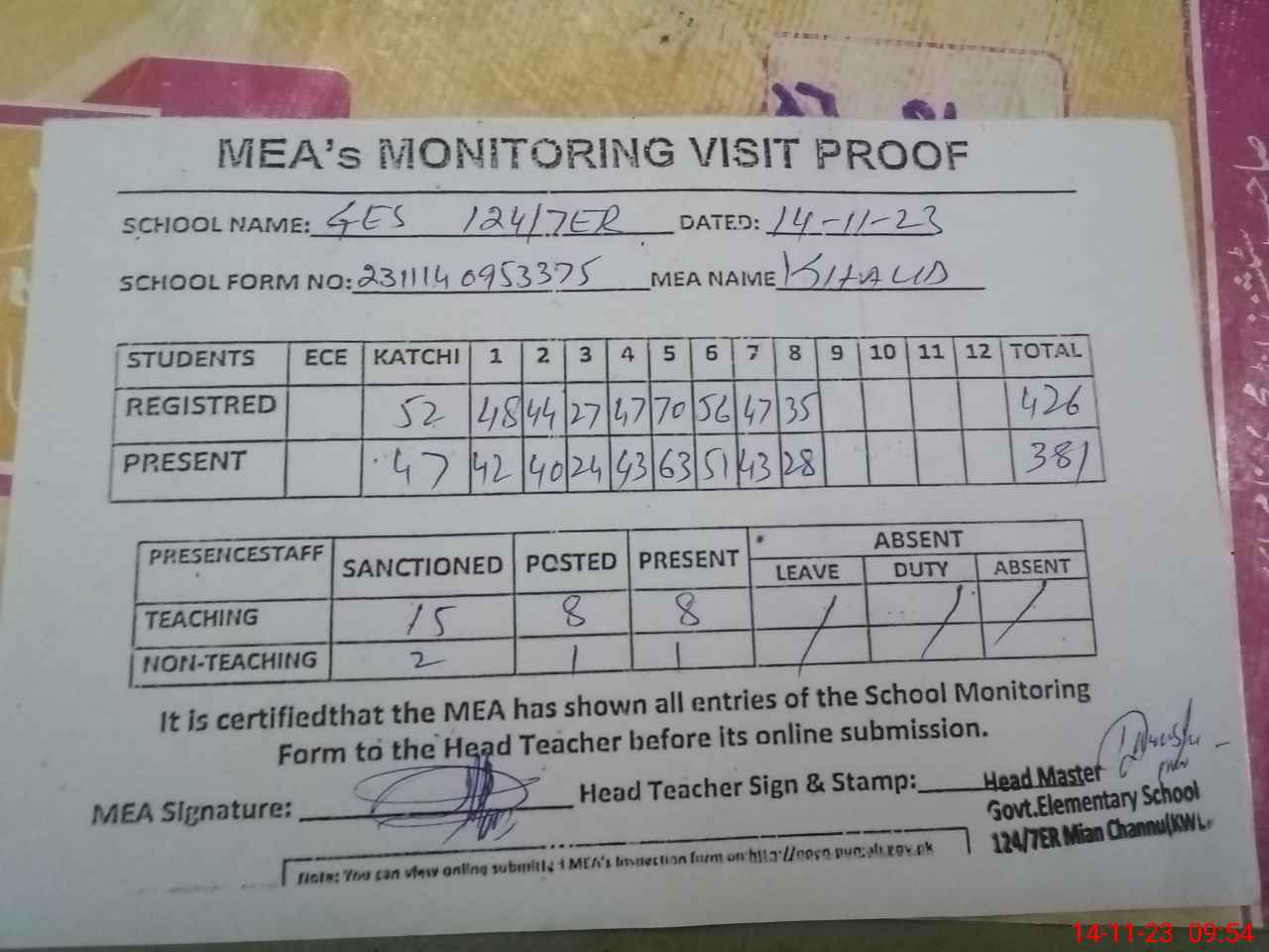 | Attendance Register | Head Teacher | MEA with School | Visit Proof |