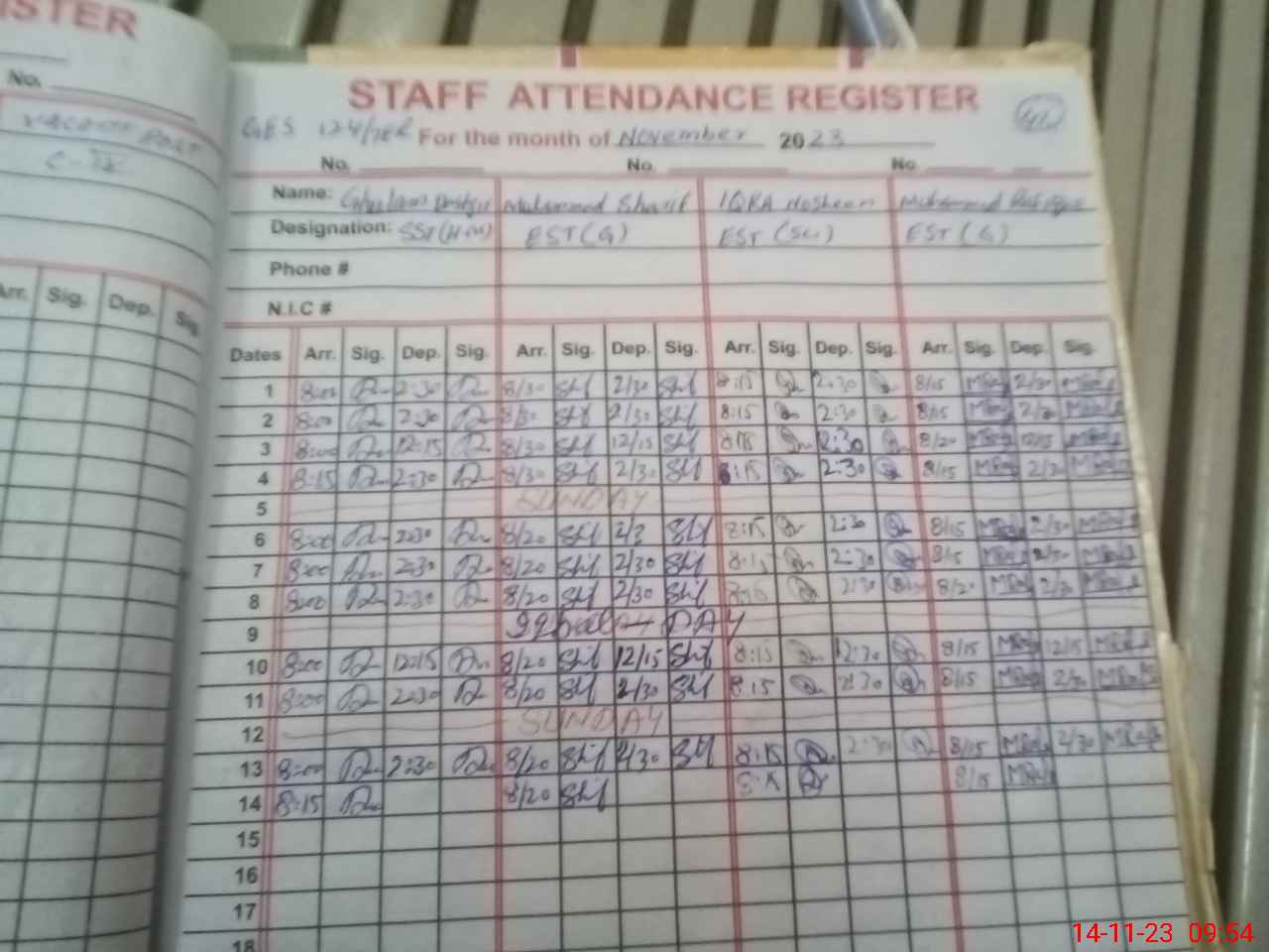 | CNIC | Full Name | Designation | R/C | Absence During Last Calender Month |
