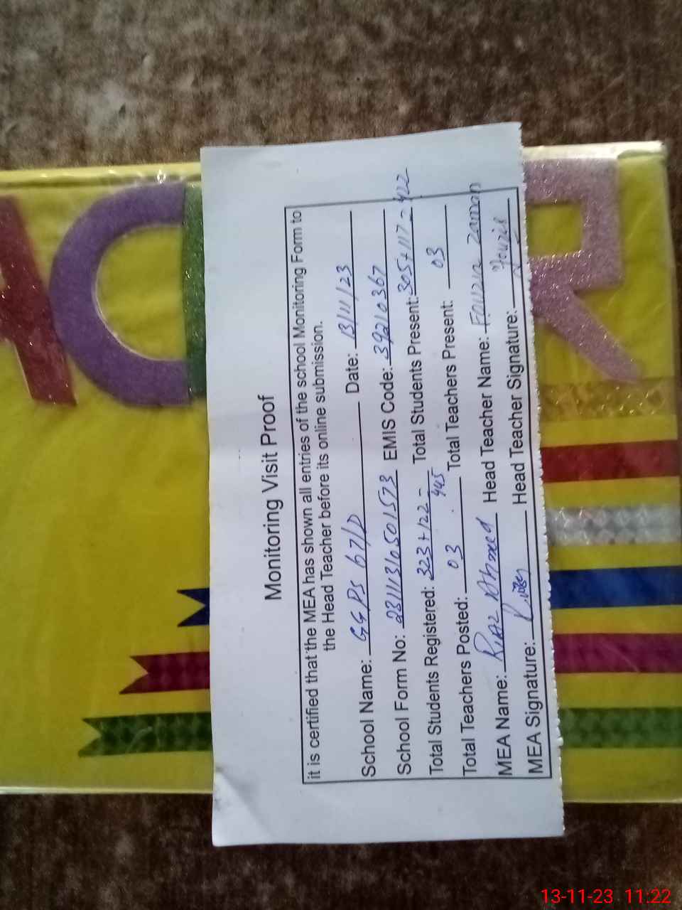 | Attendance Register | Head Teacher | MEA with School | Visit Proof |