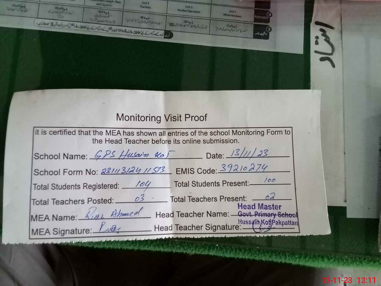 | Attendance Register | Head Teacher | MEA with School | Visit Proof |