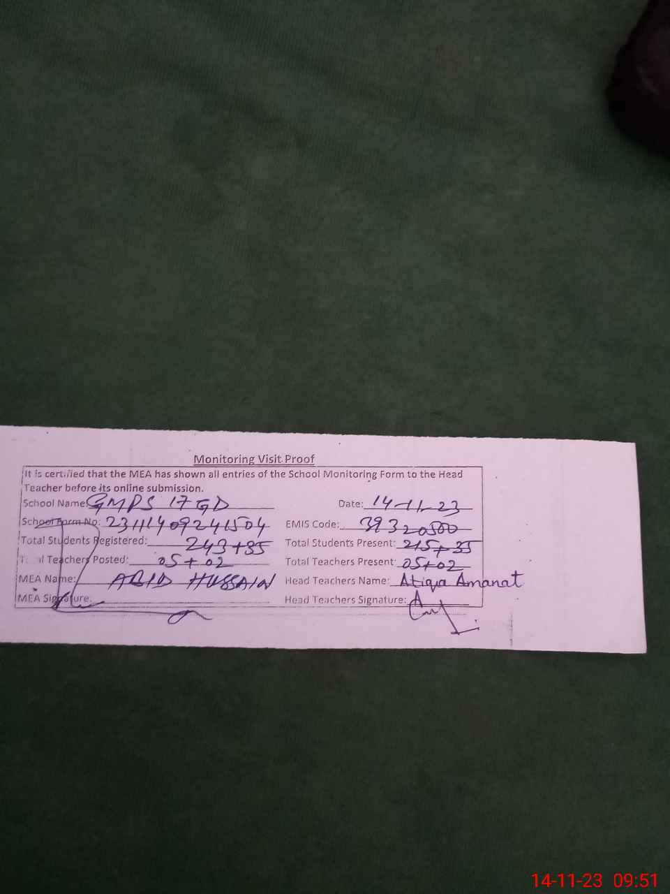 | Attendance Register | Head Teacher | MEA with School | Visit Proof |