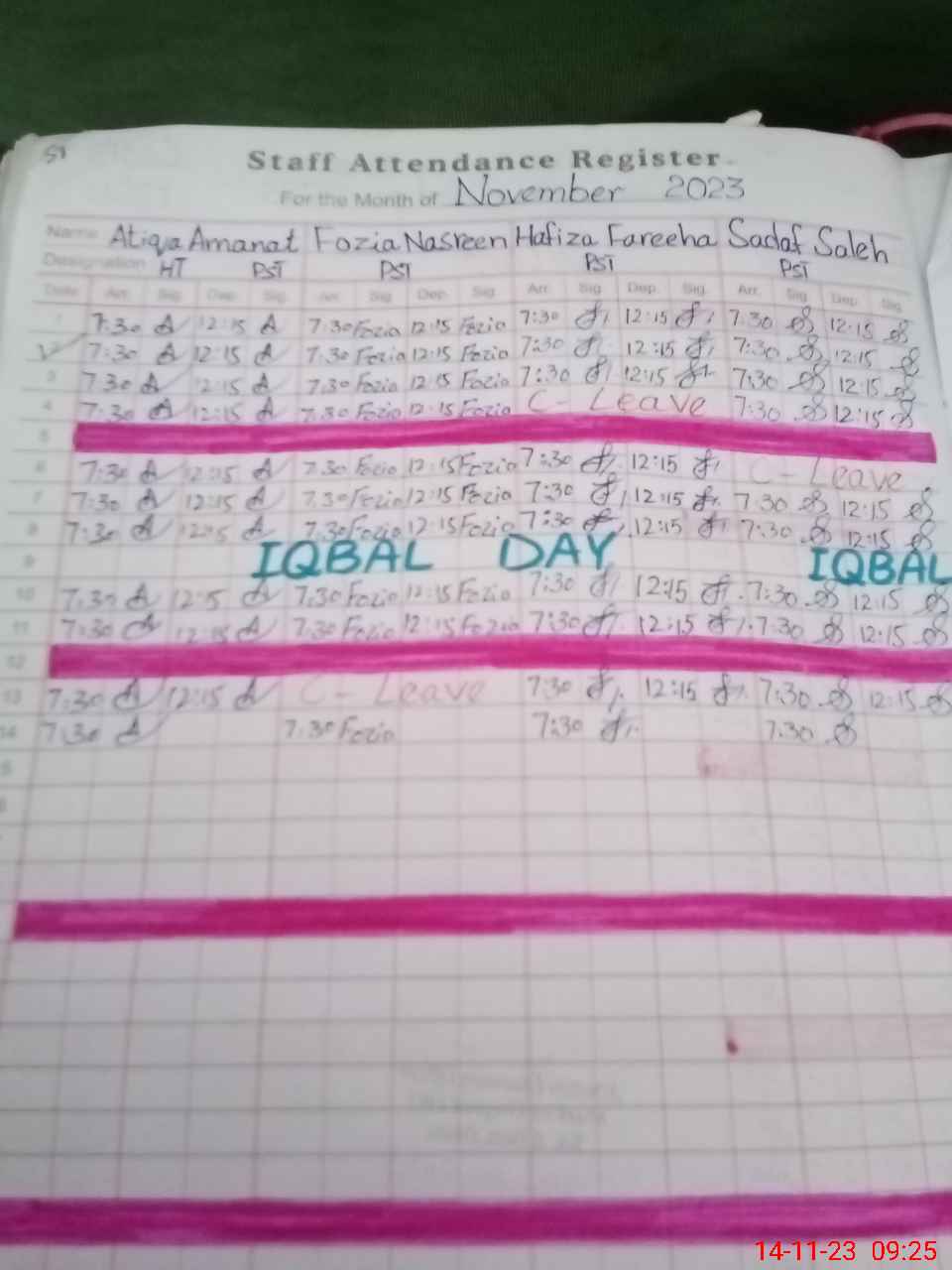 | CNIC | Full Name | Designation | R/C | Absence During Last Calender Month |
