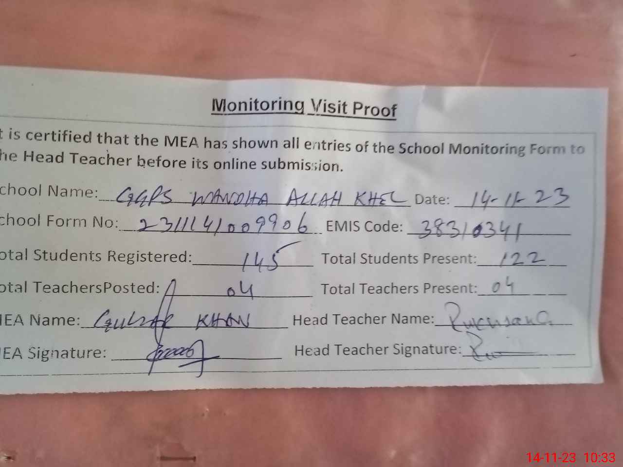 | Attendance Register | Head Teacher | MEA with School | Visit Proof |