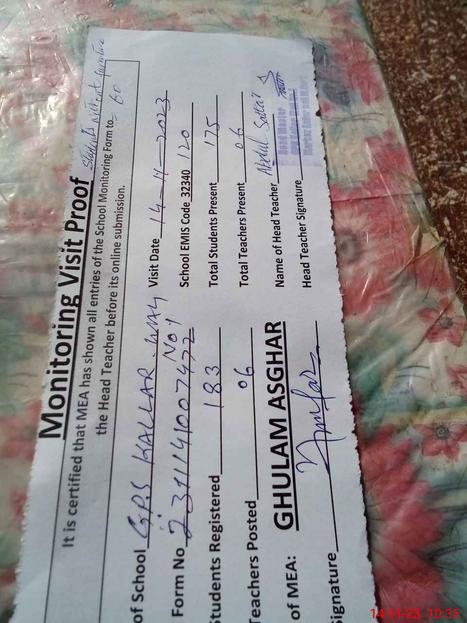 | Attendance Register | Head Teacher | MEA with School | Visit Proof |