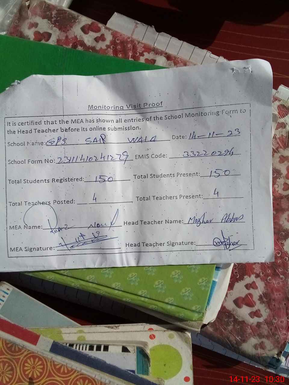 | Attendance Register | Head Teacher | MEA with School | Visit Proof |
