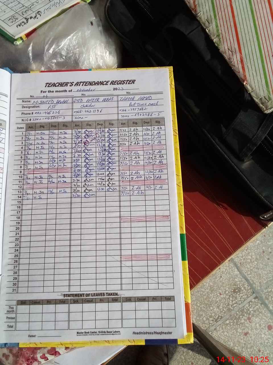 | CNIC | Full Name | Designation | R/C | Absence During Last Calender Month |