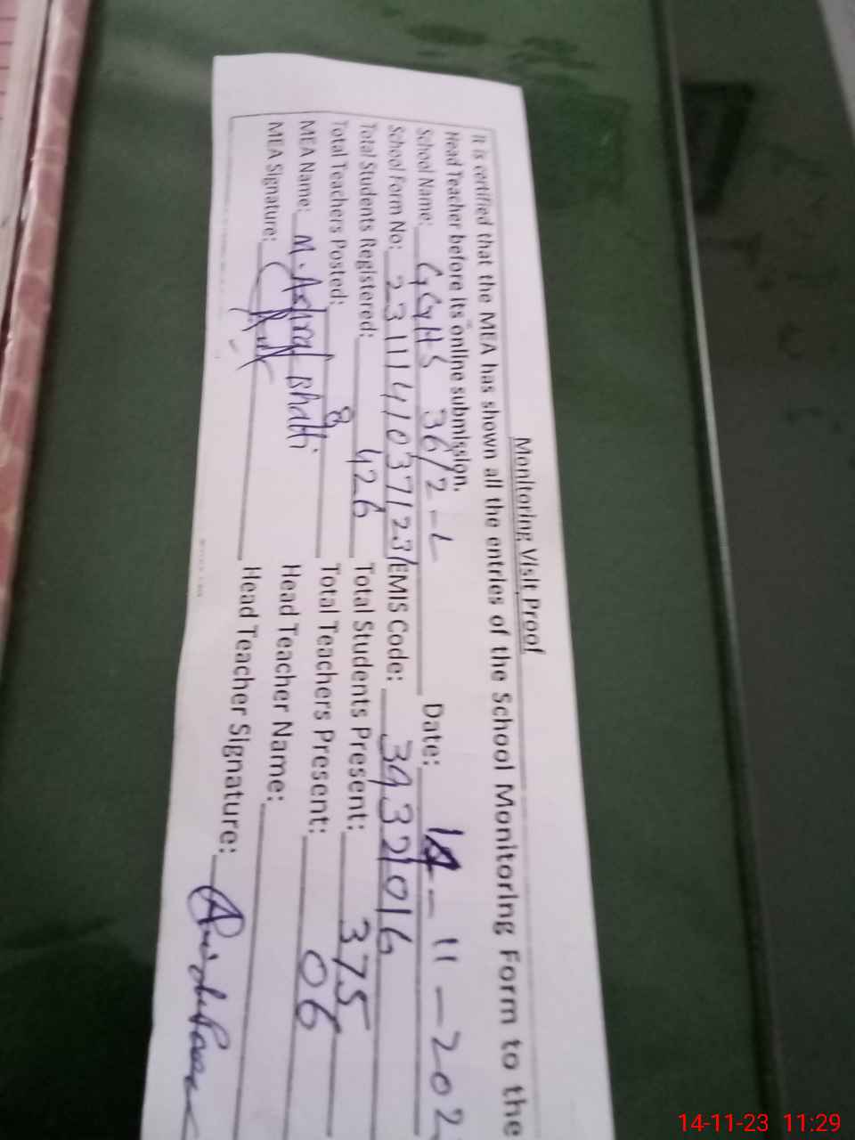| Attendance Register | Head Teacher | MEA with School | Visit Proof |