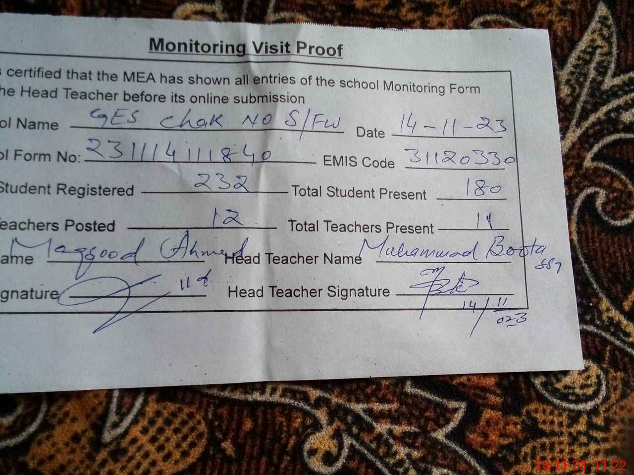 | Attendance Register | Head Teacher | MEA with School | Visit Proof |