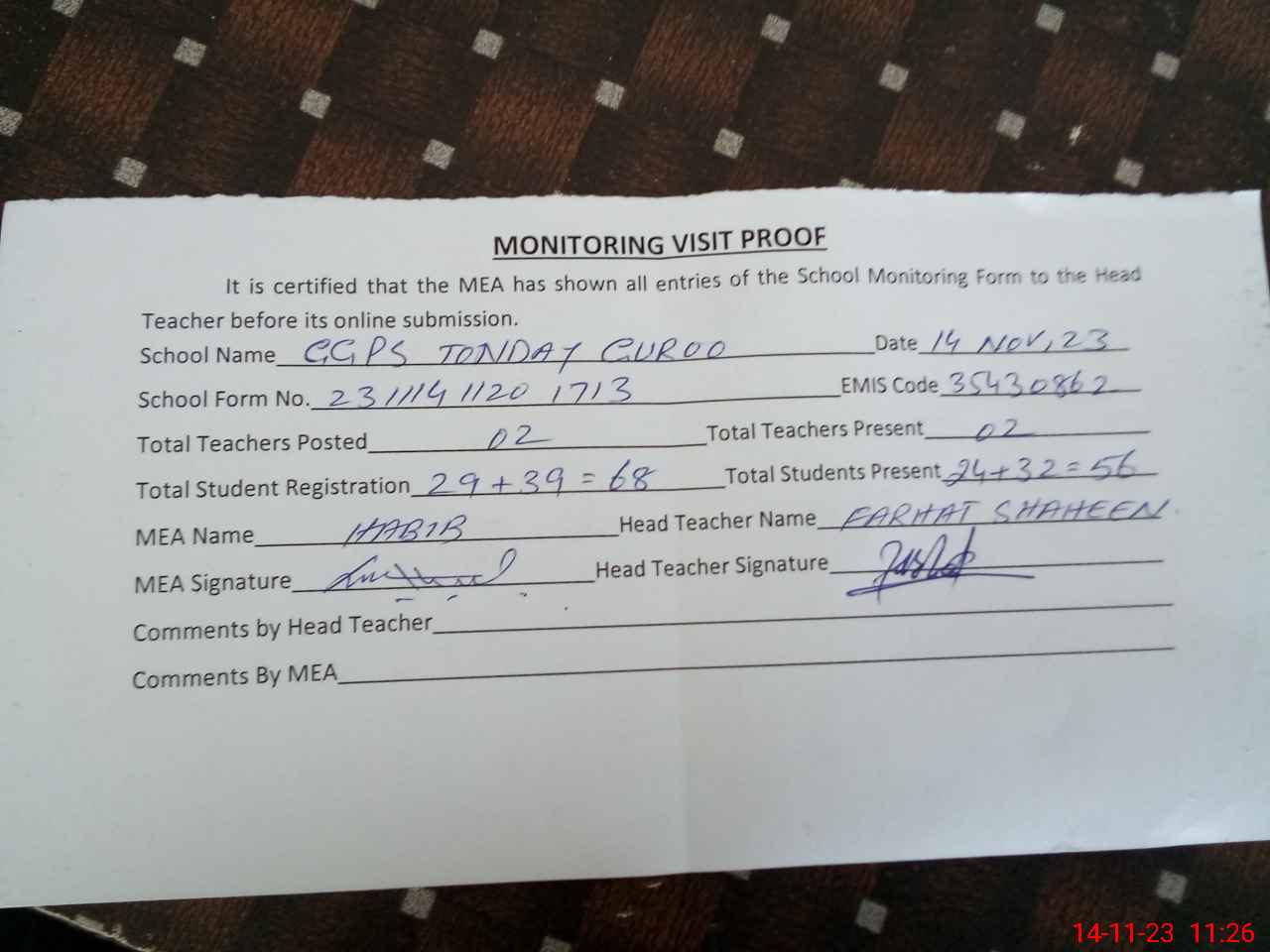 | Attendance Register | Head Teacher | MEA with School | Visit Proof |