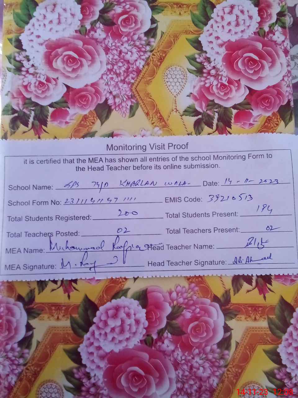| Attendance Register | Head Teacher | MEA with School | Visit Proof |