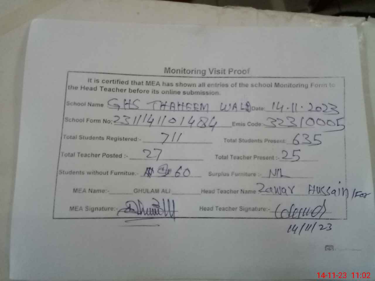 | Attendance Register | Head Teacher | MEA with School | Visit Proof |