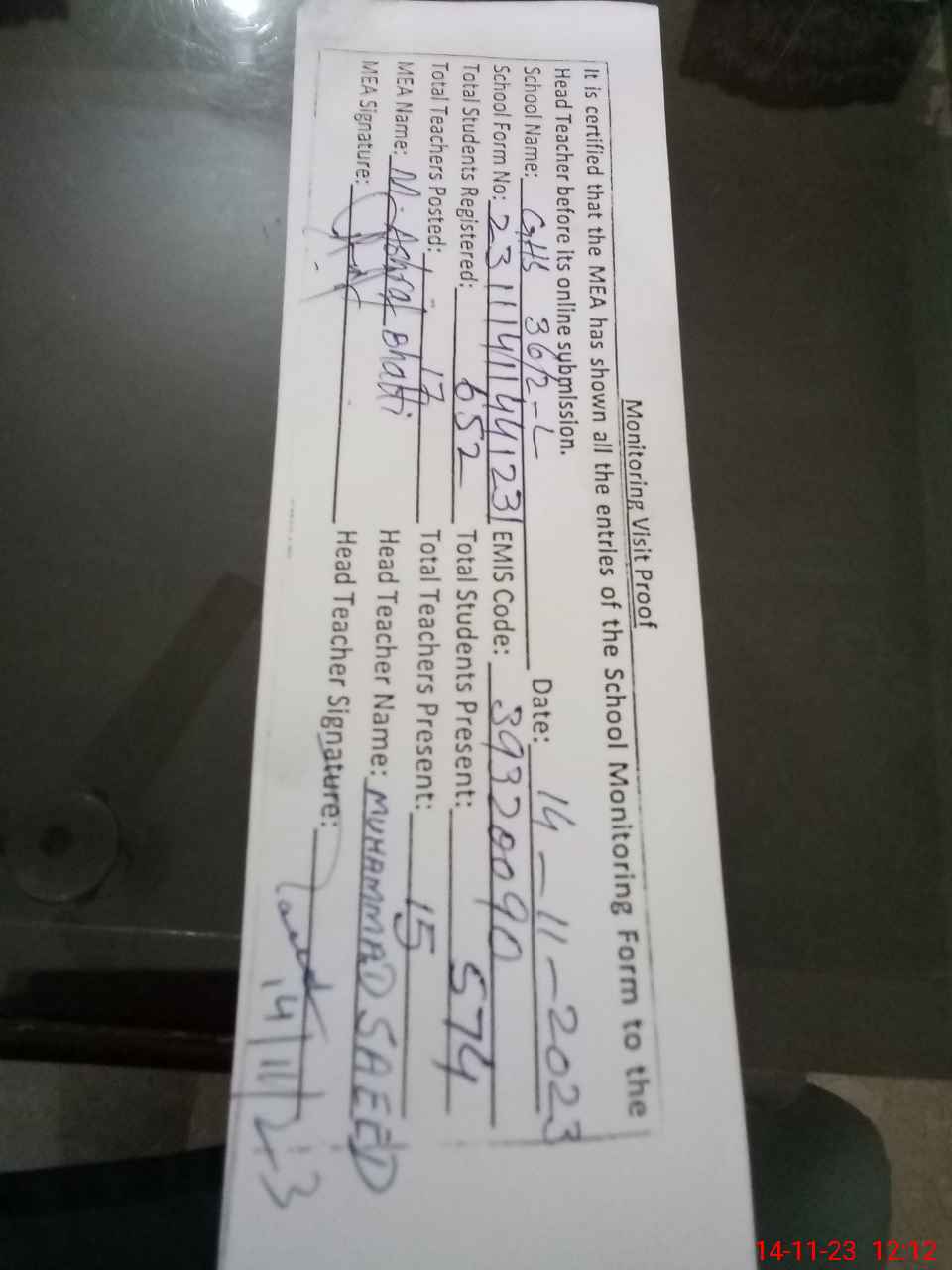 | Attendance Register | Head Teacher | MEA with School | Visit Proof |
